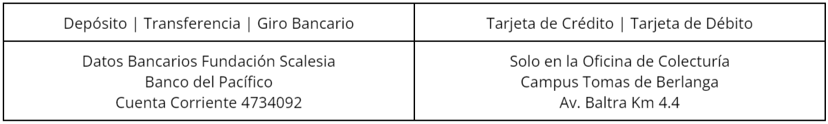 Una vez que hayas realizado el pago de los servicios educativos envía tu comprobante de pago por correo adjuntando los datos del estudiante (cédula y nombres completos).